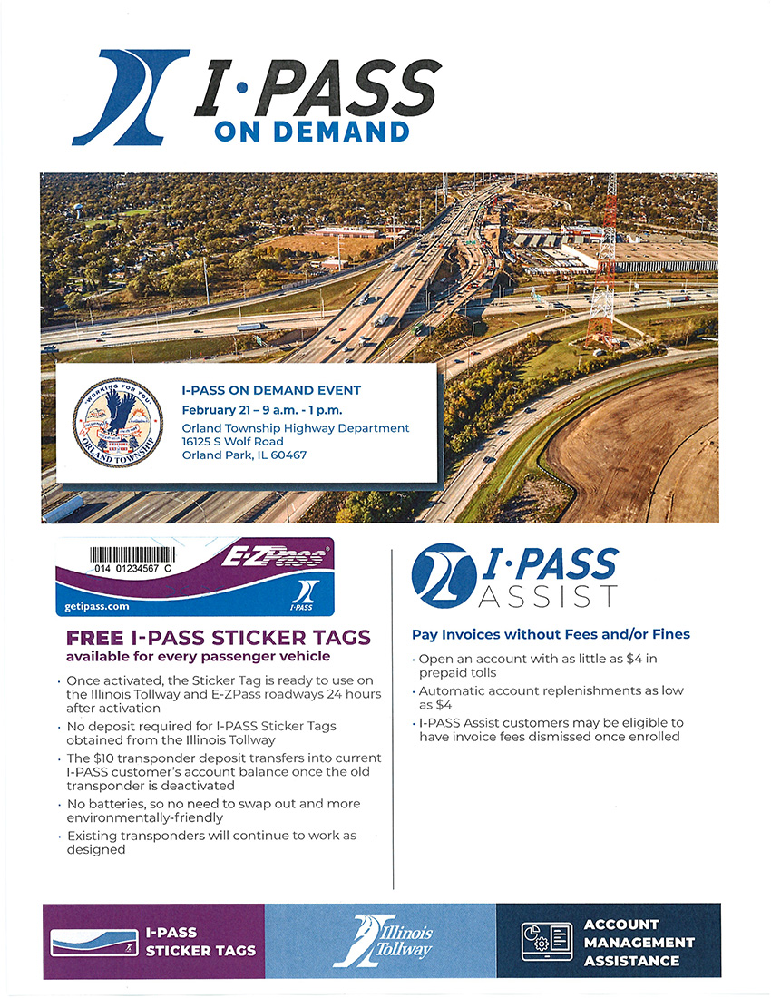 Orland Township Highway Department is hosting a FREE I-PASS Sticker Event for all passenger vehicles on February 21st from 9AM-1PM. Stop by the Highway Department main office to pick up your free sticker, no deposit required.