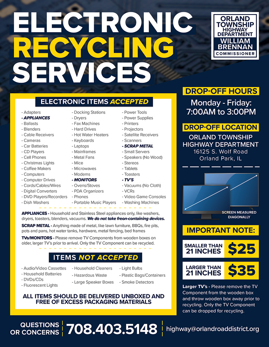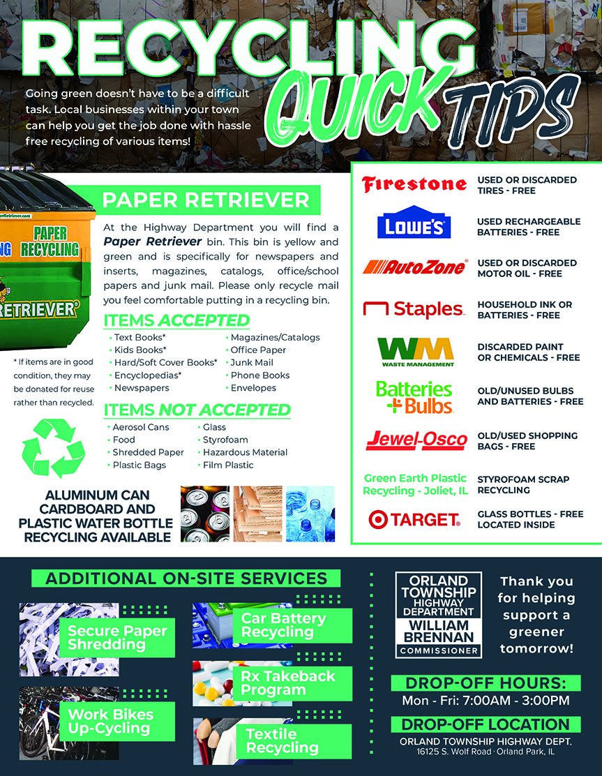 Recycling services are located at 16125 S. Wolf Road, Orland Park and the hours they are available to the public is Monday through Friday from 7 a.m. to 3:00 p.m.